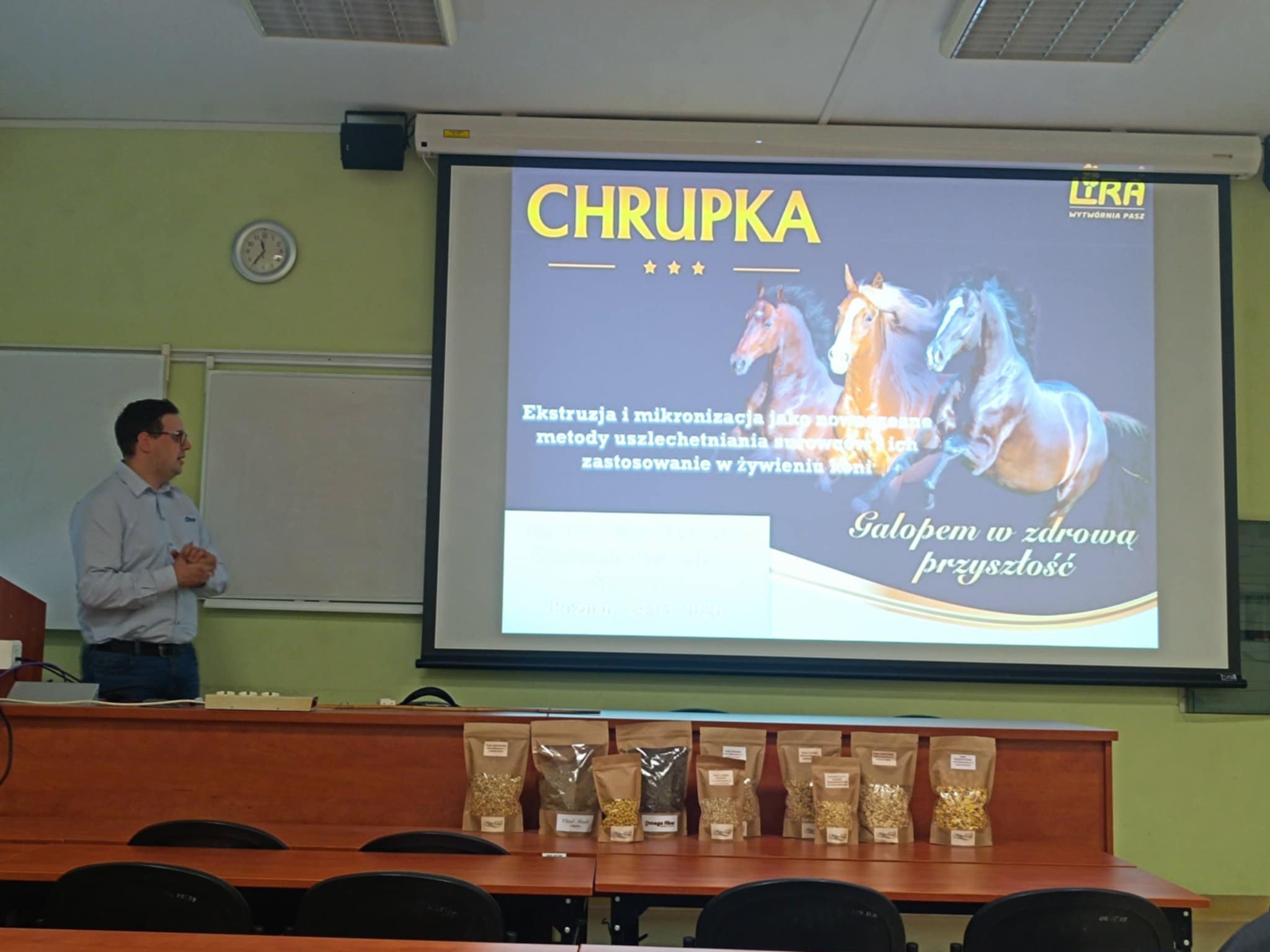 Podczas prelekcji Pan magister, będący absolwentem zootechniki (I stopień) oraz studiów dualnych z zakresu żywienia zwierząt (II stopień) na naszym Wydziale, skupił się przede wszystkim na zastosowaniu nowoczesnych technologii (mikronizacji i ekstruzji) w uszlachetnianiu surowców do produkcji pasz dla zwierząt. Szczególne zainteresowanie słuchaczy wzbudził wpływ stosowania wspomnianych metod na poprawę strawności i smakowitości pasz dla koni.