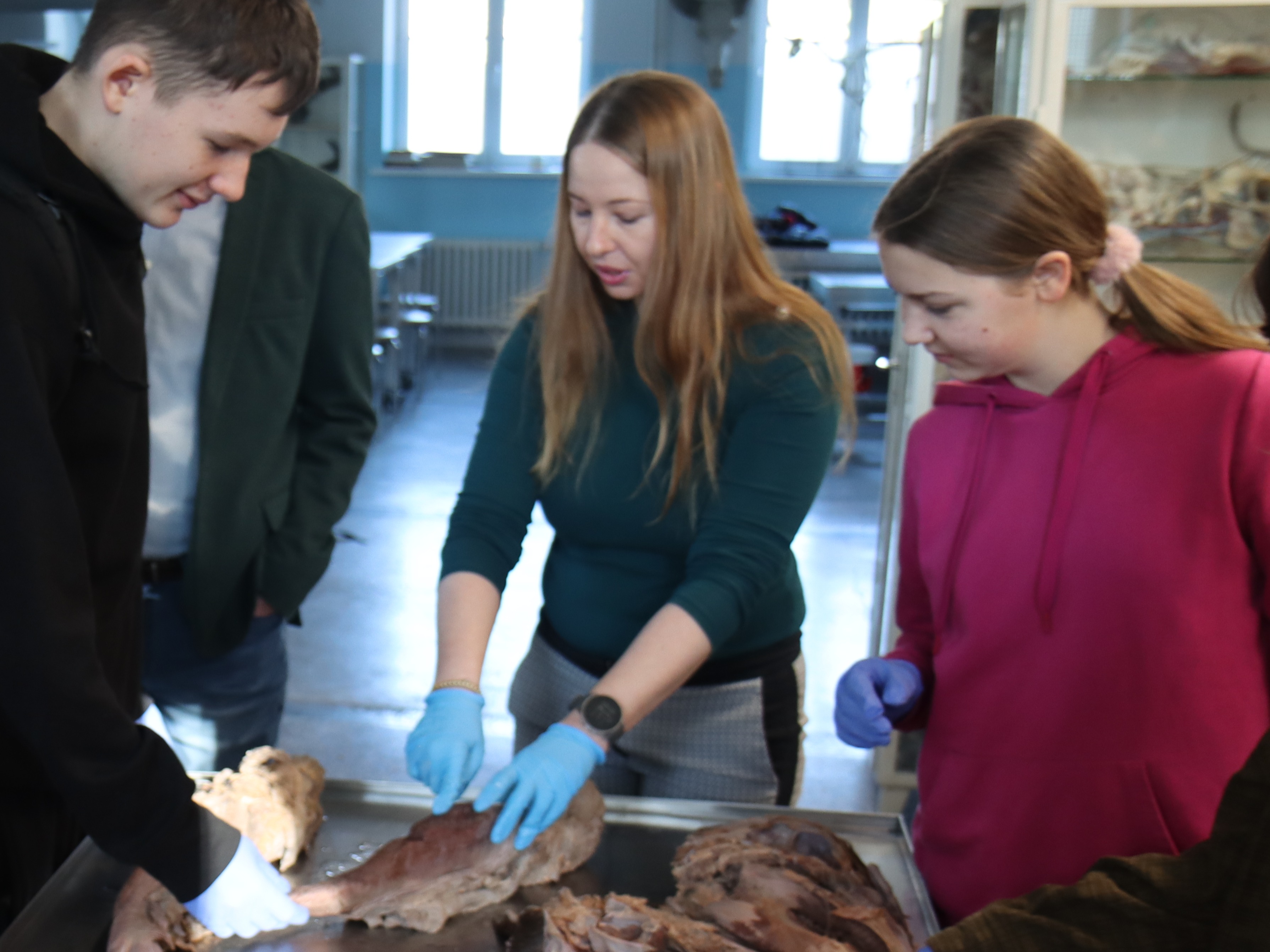 Uczniowie dowiedzieli się jak wygląda praca zootechnika i weterynarza i dlaczego warto studiować te kierunki J Nauczyli się rozróżniać i prawidłowo nazywać kości zwierząt, obejrzeli szkielety m.in. niedźwiedzia, żubra, łosia, konia, krowy, świni i dzika. Bardzo odważnie i z ogromną ciekawością podeszli także do obserwacji mięśni i narządów wewnętrznych psów.